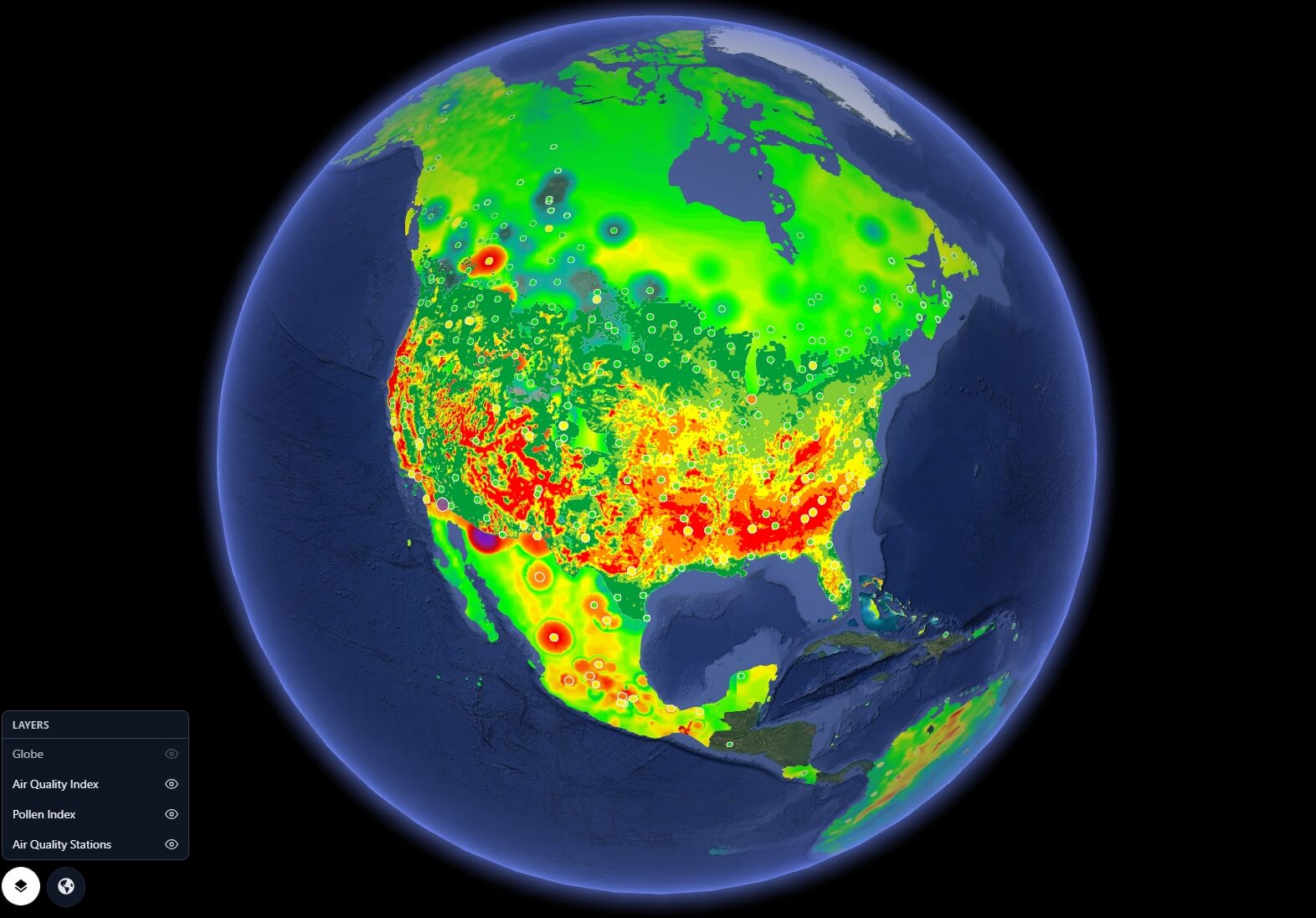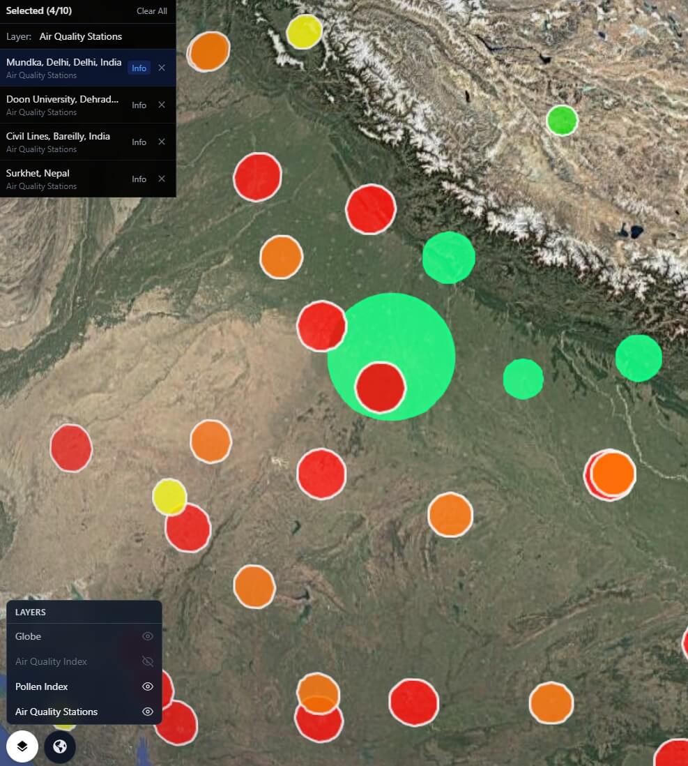 - Every OpenAQ station plotted as a geo-located dot on the globe