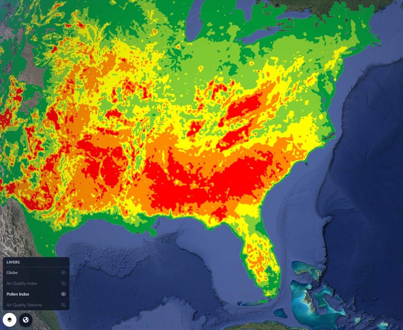 - Pollen Index tiles (Tree, Grass, Weed) draped over the 3D globe surface