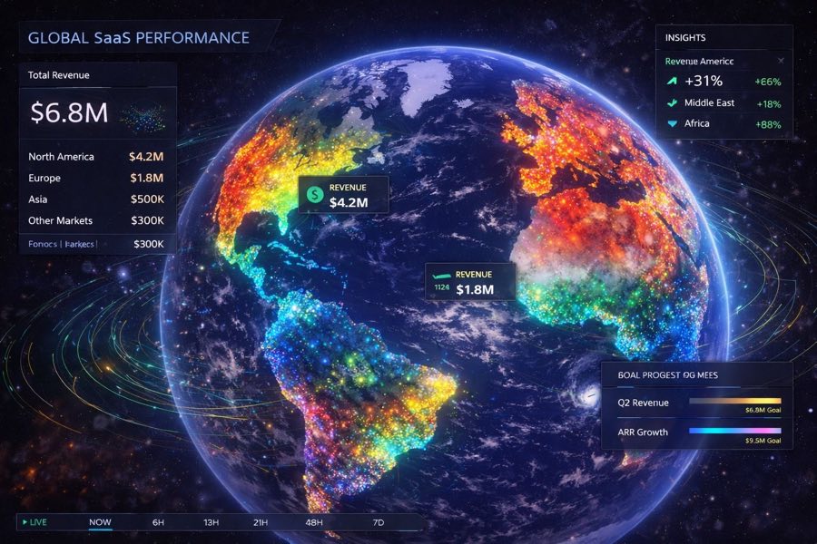 Track customer growth, engagement, retention, and revenue performance on a 3D globe — to identify what is driving momentum, where friction is building, and how to act faster.