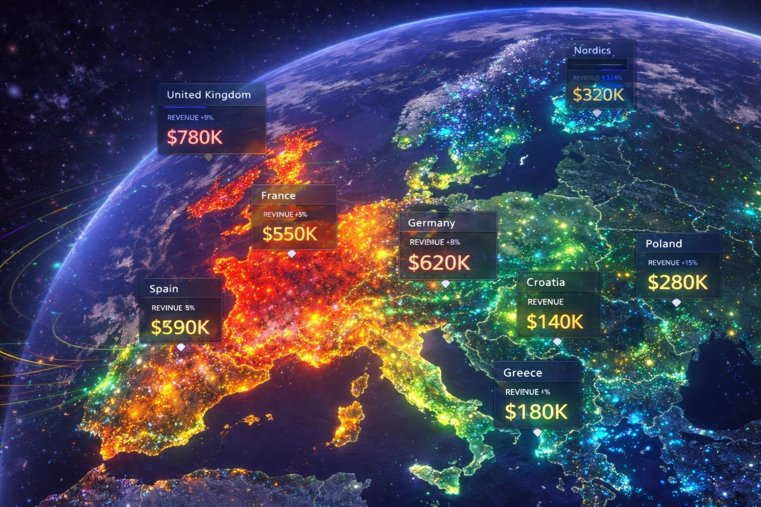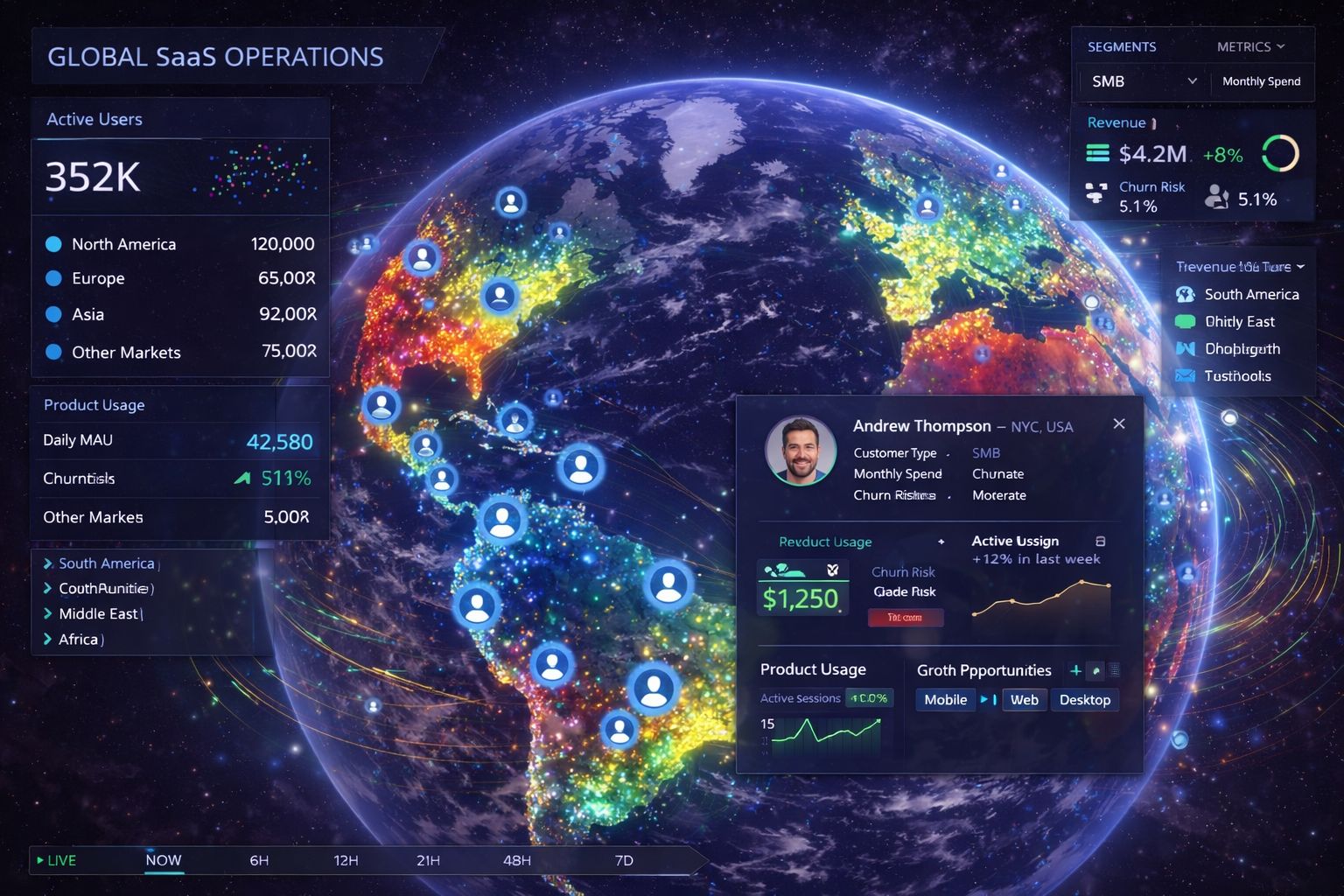 Track customer growth, engagement, retention, and revenue performance on a 3D globe — to identify what is driving momentum, where friction is building, and how to act faster.